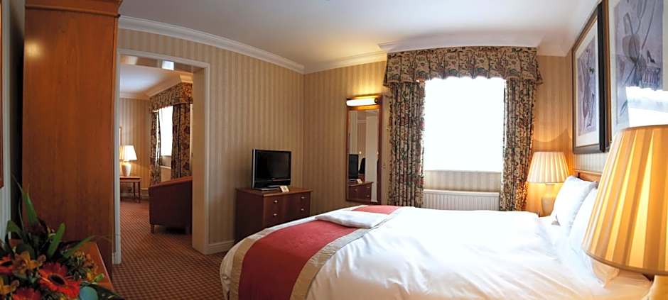 This suite features a super king-size bed, a lounge area with a sofa and armchair, as well as a TV, and a dining table. Additional amenities include a writing desk, tea/coffee making facilities and a laptop safe.